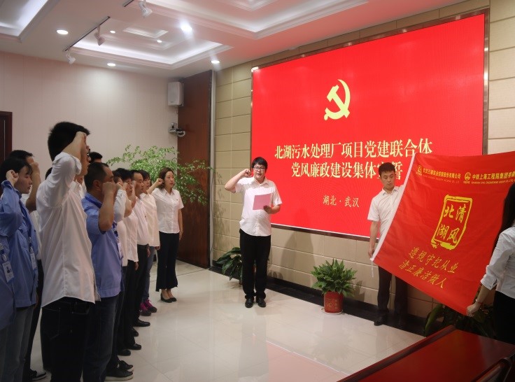 當(dāng)天下午,武漢北湖污水處理廠項(xiàng)目黨建聯(lián)合體舉行了“清風(fēng)北湖”黨風(fēng)廉政建設(shè)主題活動(dòng)啟動(dòng)儀式。首先進(jìn)行廉潔從業(yè)承諾宣誓,北湖項(xiàng)目黨建聯(lián)合體各成員單位共20余名黨員在黨徽下共同進(jìn)行了莊嚴(yán)宣誓,均表示要自覺遵守紀(jì)律法規(guī),帶頭改進(jìn)工作生活作風(fēng),自覺潔身端行,絕不以權(quán)謀私。宣誓結(jié)束后,聯(lián)合體各方代表共同簽訂了工程建設(shè)廉潔共建協(xié)議書,明確了各方廉潔共建責(zé)任及在工程建設(shè)過程中應(yīng)遵守的廉潔從業(yè)要求。最后,與會(huì)領(lǐng)導(dǎo)人員分別簽訂了廉潔從業(yè)承諾書,項(xiàng)目黨建聯(lián)合體全體黨員集體手抄《中國共產(chǎn)黨廉潔自律準(zhǔn)則》,進(jìn)一步加強(qiáng)了項(xiàng)目黨員職工黨性紀(jì)律及廉潔自律意識(shí)。
