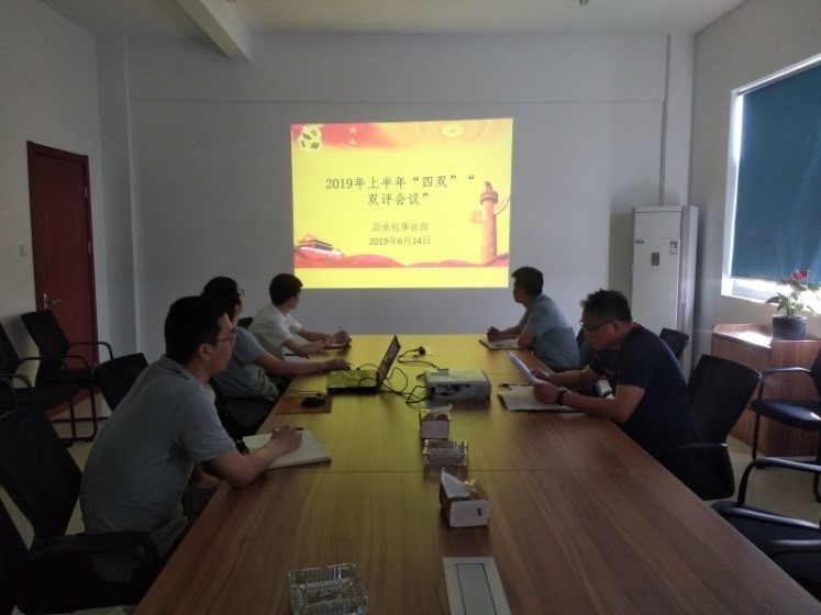 614日,總承包事業部黨支部組織召開2019年上半年“四雙”“雙評”工作會議,事業部全體員工參會。(白勇龍)