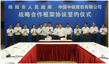 831日,股份公司與綿陽市人民政府舉行戰略合作框架協議簽約儀式。中國中鐵股份有限公司副總裁劉輝,綿陽市委副書記、市長劉超見證簽約并致辭。