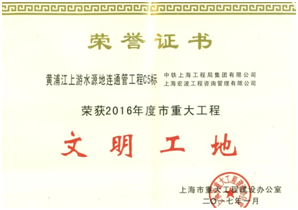 近日,從上海市重大工程建設(shè)辦公室傳來佳訊,由公司承建的上海黃浦江上游水源地連通管工程C5標(biāo)項目榮獲上海市“2016年度重大工程文明工地”稱號,為公司再添榮譽(yù)。