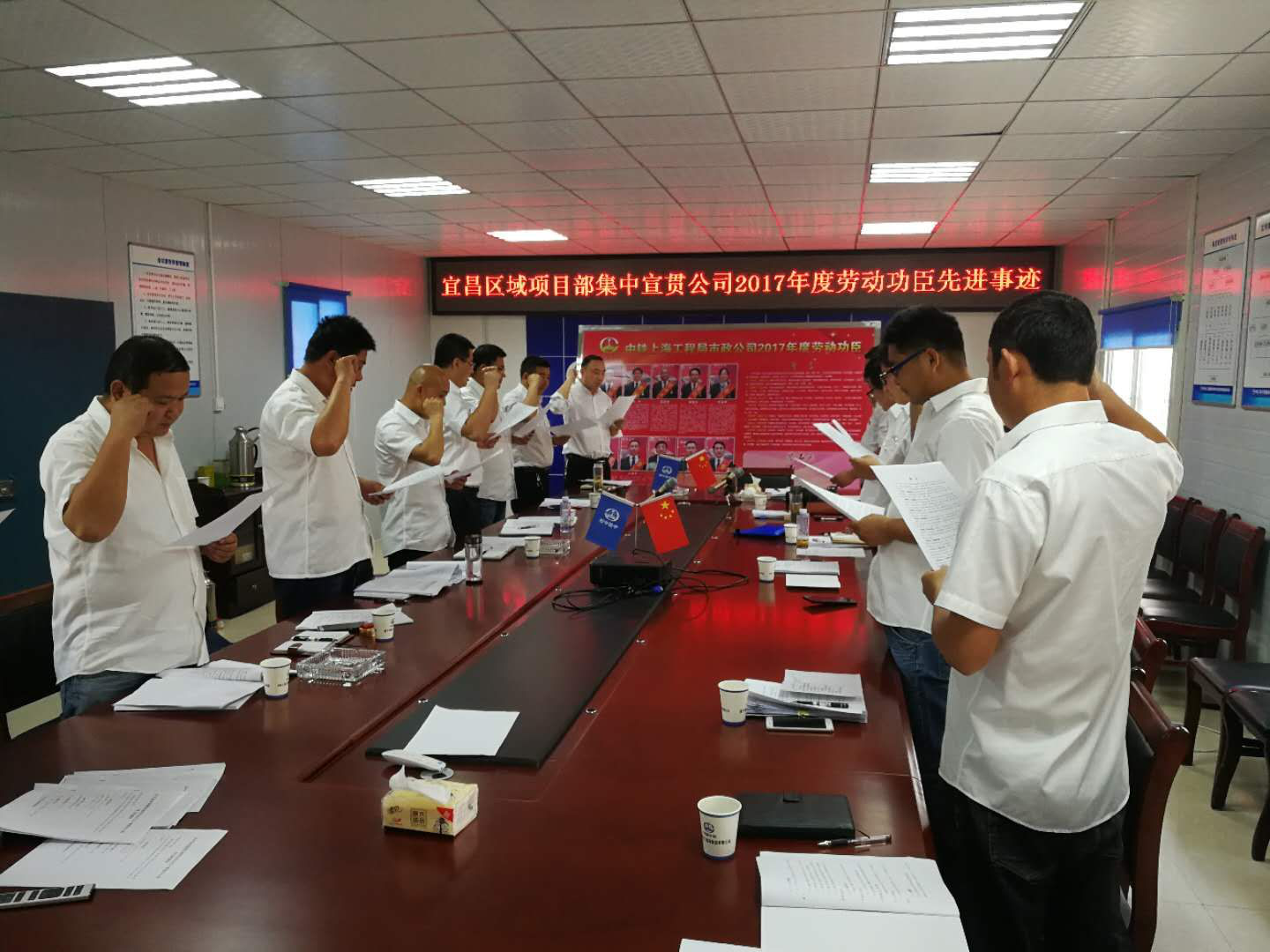 ☆4月14日下午,揭陽項目黨支部組織開展學習公司2017年度“勞動功臣”活動。項目黨支部書記向大家介紹了“勞動功臣”的先進事跡,倡議全體員工認真學習模范精神,緊緊圍繞項目生產中心,積極投身項目黨支部組織開展的勞動競賽活動,認真履行崗位職責,重點抓好安全、質量管控,推進科技創新活動,全面落實競賽目標,確保項目順利實施。最后,全體員工進行重溫公司誓言活動,大家舉手在光榮榜前莊嚴宣誓,鄭重簽下自己的名字,大家立下決心,要做好最后的攻堅戰,確保按照業主要求順利通水。(雷文莉)